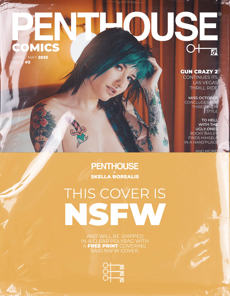 Cover Photo featuring Skella Borealis. Photo taken by Paranoid Android Photography. Penthouse Comics is back with new comics, new photoshoots, and new surprises. Returning writer JD Morvan continues his storytelling of a world long gone. Rocky Bailey, a hunk living in Los Angeles that has decided to keep his virginity until he hits twenty finds that there's someone out there with malicious plans for him. But that someone is going to quickly find out that Rocky isn't the one to mess with. Continuing from Penthouse Comics Year One are Miss October and Gun Crazy. Both at places where new fans can pick up on the stories without missing a beat. Miss October continues the story of a mysterious serial killer that is killing women one by one and getting closer to our very own, Miss October. Lieutenant Clegg's investigation has stalled and Viktor must take a leap of faith to get the answers they need before it's too late. Meanwhile, Gun Crazy 2 continues the violent road trip of Dolly and Lanoya, our two ladies in search of a better life. Everyone has arrived in Las Vegas and there will be no restraint on life and death… for fans of Tarantino and the 80s. And another brand new surprise ongoing story! Beyond that we have a photoshoot featuring our first returning Penthouse Comics Pet, Skella Borealis.