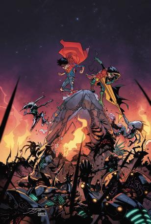 ‘Planet of the Capes’ part four! Superboy and Robin were training to become the next Superman and Batman-but they never signed up to be the saviors of the multiverse! Ready or not, the boys have their work cut out for them as the endless alien armies of Yggardis descend upon our young heroes!